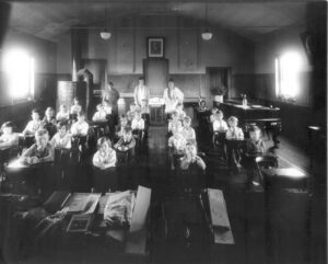 brick schoolhouse, first opened on January 3, 1846. Three teachers stand