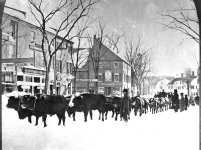 Compacting, not removing snow, using heavy logs dragged by oxen