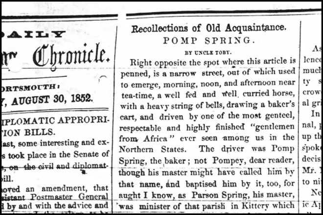 Although he was only a child when Pomp Spring died, Tobias Miller (1801-1870) claimed to have met the popular Portsmouth baker. A minister, printer and journalist, Miller wrote a history column for the Portsmouth Chronicle entitled “Recollections of Old Acquaintances.”