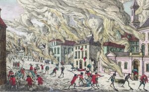 While HMS Scarborough stuck around to worry the locals, Capt. Mowat (1734-1798) of HMS Canceaux was ordered to cruise the coast of the District of Maine, then part of the province of Massachusetts. Mowat was briefly captured by patriot American forces, but released. In mid-October 1775, Capt. Mowat and a small fleet sent a message to the people of Falmouth, Massachusetts, now Portland, Maine. Mowat was ordered, he explained, to “execute a just punishment” on rebellious New Englanders who had attacked British merchant ships and boycotted British products. Locals were given two hours to “remove without delay the human species out of the said town.”