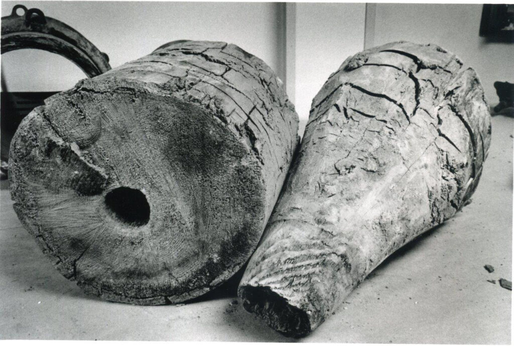Erase the bold architecture of towering Roman aqueducts from your mind. By definition, an “aqueduct” refers to any man-made channel for conveying water. Wooden logs were plentiful and cheap, as were the original aqueduct investors. Hundreds of cedar logs, 10 to 14 feet long, were “docked” or stripped of their bark, then hollowed out. Skilled workers, employed by an Exeter contractor, drilled the two-inch diameter holes dead center (five inches diameter at the head of the network) using a an iron auger. One end of each log was shaved into a cone that was then fitted into the scooped-out end of the next log. The connections were sealed with pitch and
