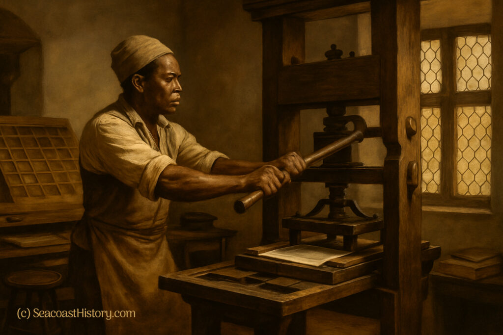Daniel Fowle’s original print shop just off Pleasant Street is gone. The site is now part of the Portsmouth Black Heritage Trail, and a prominent brass plaque recognizes the enslaved man who printed New Hampshire’s first newspaper, week after week, year after year.