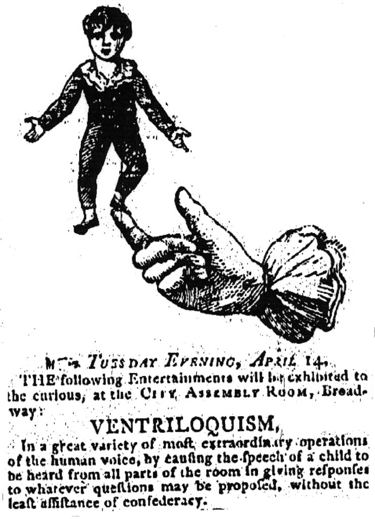But it was Potter’s ability to throw his voice that drew the greatest praise. Instead of the wisecracking laptop dummy so familiar to modern audiences, Potter’s ventriloquism filled the hall with invisible birds, animals, and crying babies. He could make the plaintive voice of a small child speak from a man’s pocket or a woman’s hand warmer. Another child, its tiny voice muffled, might sound from behind a door, begging to be let in from the cold.