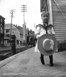 The little boy in the sailor suit with the giant hat (I’m guessing boy, but I could be wrong) is standing on Daniel Street in Portsmouth. The year (I’m guessing again) is between 1890 and 1900. I particularly like the low child-height angle of this photo, rare and even experimental for the time period.