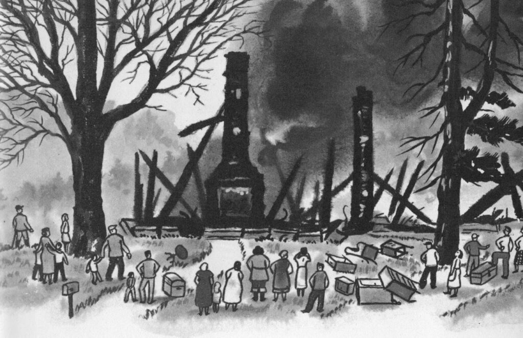 Molloy’s book, “Lucy’s Christmas” (1950), is set closer to home in the woods of Maine. On the opening page, 12-year-old Lucy Brackett’s home burns down. Her father, a logger, toils to earn enough money to rebuild their home by Christmas, but his earnings don’t match his dreams. Saddened that her little brothers will go without Christmas gifts, Lucy scratches a message on a piece of birch bark. She hides the note in the branches of a felled spruce that her father hopes to sell as a Christmas tree. Perhaps, she hopes, some wealthy buyer far away will find her note and send gifts to her brothers. But at the railroad station, the note falls from the branches. It is picked up by the stationmaster–and here comes the miracle – he calls his neighbors together. They build a new house for the Brackett family, just in time for Christmas. Like a message in a bottle, Lucy’s unselfish wish has inspired an entire town to charity.