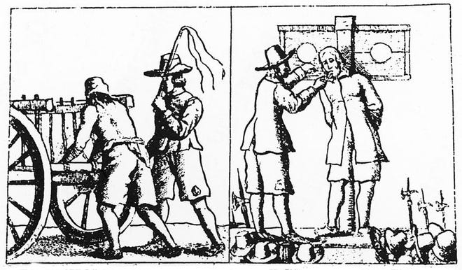 Beyond the “supernatural” stoning of George Walton, the most famous local example of Quaker persecution comes from Dover. In 1662, three Quaker women from England preached briefly before they were arrested. Ann Coleman, Mary Tompkins and Alice Ambrose were stripped to the waist and tied to the back of a cart. They were sentenced to walk 80 miles in harsh winter weather and be whipped publicly in every town they passed until they were driven out of the region.