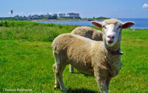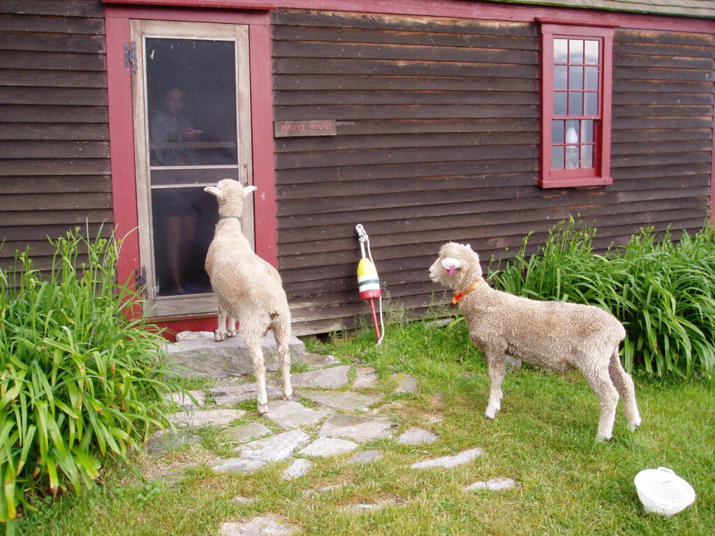 Help arrived on the next boat. By “shear” coincidence, our longtime friend Peter Lamb (his real name) was visiting. Peter used to raise sheep and is a founder and former director of the NH Farm Museum in Milton, NH. Grabbing a few tools and scrap lumber, he patched my makeshift paddock. Rosie and Dave could still find their way onto the main lawn, but for the next two nights, they largely stayed within their assigned space, also a rare shady spot on an island without trees. We left their water and grain in the same place. Sheep are creatures of habit, Peter explained.
