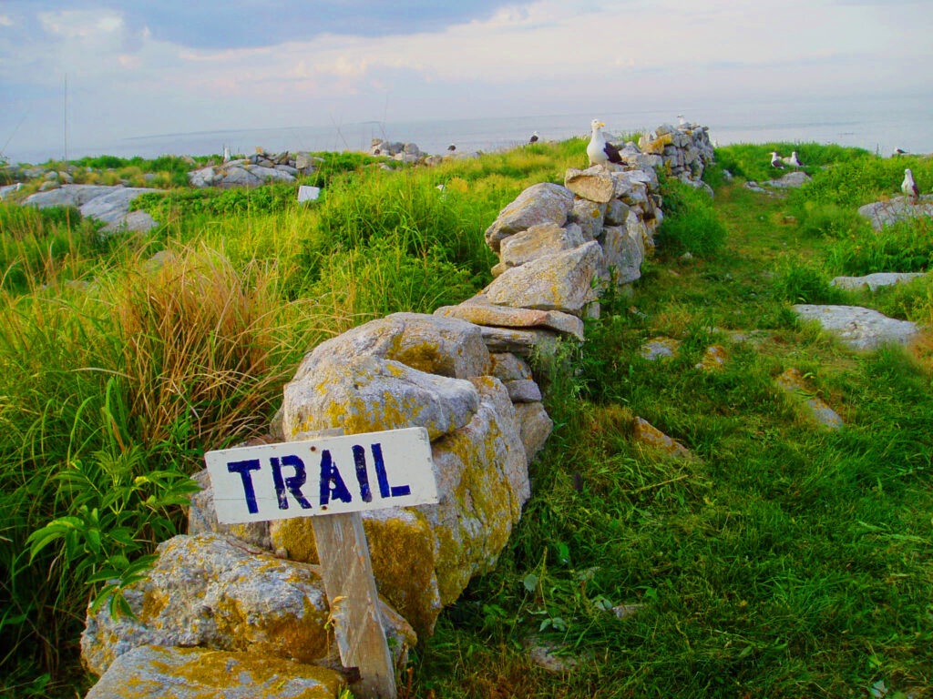 Carrie gave us a brief course in the care and feeding of sheep. Basically, they wander and eat grass, something Smuttynose has in abundance. My summer job is to mow the lawn and weed-whack the primitive trail that meanders over rocks, past seagulls and through bracken and poison ivy to the back end of the 27-acre island. Steward Laurence Bussey suggested that Rosie and Dave might “help out” by clearing some of the tall grass around the many stone foundations atf what once was a busy island. Today, only two houses remain. Neither has electricity or plumbing. Stewards bring their own water, sunscreen and calamine lotion.