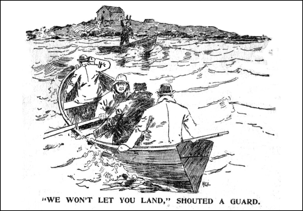 Portsmouth has talked about nothing else, politics excepted, since Mr Stephens seized the island, and today a spice of excitement was added by the report that the Howell had taken a party of sheriffs and deputies out to take possession of the island by force. The Howell’s passengers were on no more belligerent errand than getting sketches for the Globe.