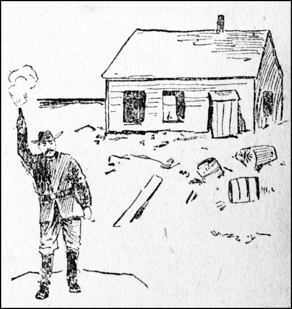 Since Mr Stevens’ party seized the Island Saturday and carried Clarence Caswell’s effects over to Smutty Nose island they have rendered Caswe;;’s house uninhabitable by removing the windows and doors. One of the men came ashore last night after provisions and he explained that the house “needed an airing.”This messenger to the main land was cut off from making his return this morning by the northeaster that was blowing. And the question of food supply is likely to become a pressing one for the men on the island, unless the weather moderates soon. A stove is also sadly needed, as the one they are using is a ramshackle old thing, incapable of giving out heat.