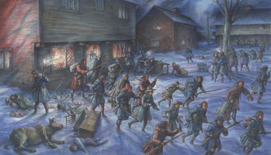 Thomas and his wife were separated during the tortuous trek on foot to Canada and, according to local legend, each believed the other was dead. Mehitable’s captor insisted that she keep her squalling infant quiet. Recounting the story in 1702, Puritan minister Cotton Mather reported that “through hunger and hardships” Mehitable had been unable to nourish her child. Warned that her Indian captor would “dispose of it,” the mother used “all possible means” to keep the baby quiet. She was forced to carry the child far from the campfire, coddling it for hours out of earshot as she crouched waist deep in snow. This went on for days until the kidnapper grew irritated with the slow progress of the settlers en route to Canada.