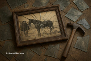 ABOUT THE PHOTO: The photo of the man with the horse is by LV Newell. It was likely not from the Confederate POW Camp, but similar. Nancy Pelletier allowed me to use the image in 2004 with the article. In 2025, working with ChatGPT, the robot and I placed the image in an artificial frame. I asked AI to make it look like the picture had ben hit with a hammer and place it on a wooden floor with the hammer and scattered glass negative –all created by the computer.
