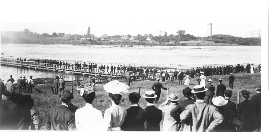 The U-shaped cofferdam shattered as planned, breaking up the rock below, followed by a small “tidal wave” that swamped bridges and washed onto the nearby shores. Fears that the earth might crack or be knocked off its axis by the explosion proved unfounded. In fact, the event went so smoothly that one Kittery resident wrote to the newspaper wondering if visitors who had traveled far, even camped out overnight, might have gone away disappointed.
