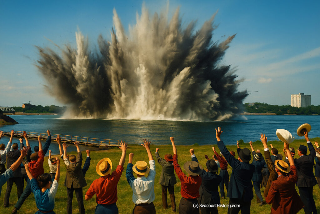 Archived photos of July 22 show great crowds climbing off Portsmouth trains and trolleys to witness the great explosion. The women are uniformly dressed in long skirts and white blouses, the men in dark sport coats with panama hats or derbies. They mug for the Kodak cameras and pose with Portsmouth policemen along the “combat zone” off Water Street.