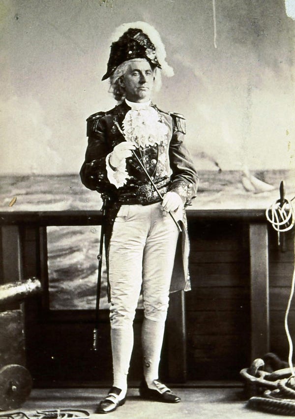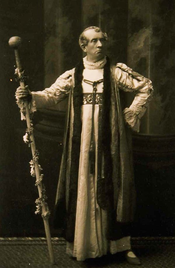 Through the artifacts we see Henry Clay Barnabee as the Sheriff of Nottingham in the comic operetta “Robin Hood,” a role he performed nearly 2,000 times. In dozens of lavish costumes he appears as a wealthy duke, a professor in a top hat, and a thickly bearded Rip Van Winkle. We see Barnabee wearing a kilt, clad in a toga, dressed as a cowboy, a soldier, a sailor, a tinker, a mayor, a nobleman and a fop. One ancient handbill announces boldly and redundantly that Mr. Barnabee “will appear in his new female character, the UNPROTECTED FEMALE, in female costume.”