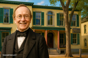 In the early 1800s the city was a shadow of its former self. Inspired by his lost law partner, Hackett threw himself into reviving both the culture and the economy of his adopted city. Hackett helped get bridges built, established a library and improved schools. As a state senator and representative for the conservative Whig party, he helped connect Portsmouth to the expanding railroad network, linking the old port south to Boston, north to Portland, westward to the state capital at Concord, and to the popular White Mountain resorts beyond. He was instrumental in establishing the country’s first National Bank at Portsmouth in Market Square. Hackett joined forces with his neighbor Ichabod Goodwin, New Hampshire’s governor, to supply President Abraham Lincoln with badly needed troops and supplies during the Civil War. He advocated for the creation of the Rice Public Library in Kittery, wrote articles for the local newspaper, taught Sunday school, and presided over the NH Bar Association. His home, after his death, became the city’s first YMCA.