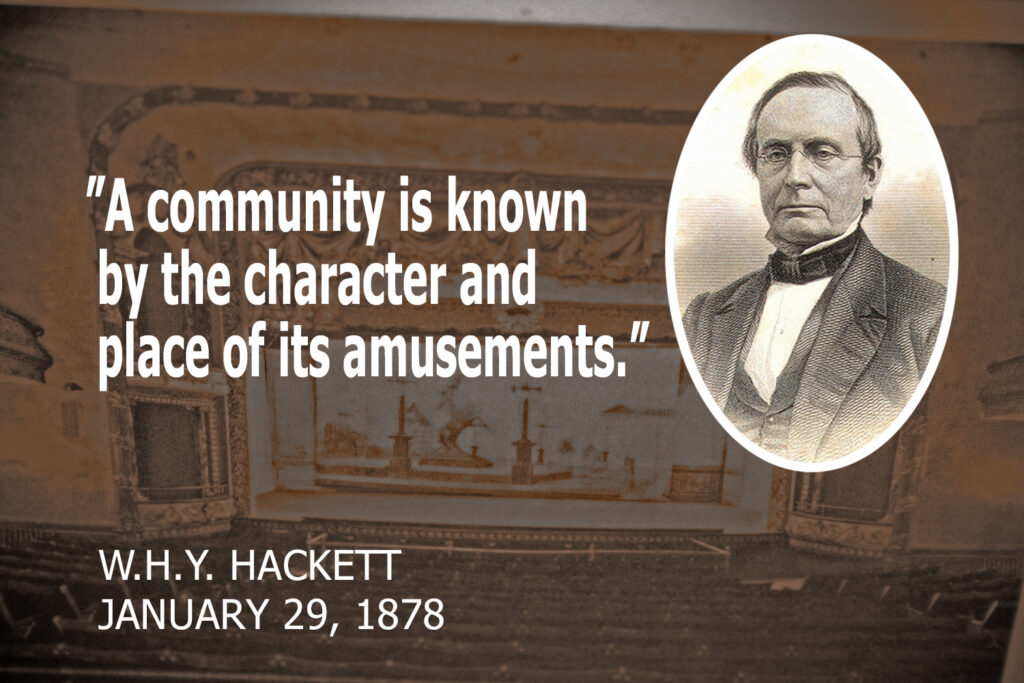 “We cannot, in company and sympathy enjoy music and the drama – those recreations which enliven, sweeten, and lengthen life – without increasing our interest in and our respect for each other,” Hackett concluded. Then, as the first Music Hall show began, the lovable and accomplished Mr. Hackett quietly stepped off the stage and into the misty annals of local history.