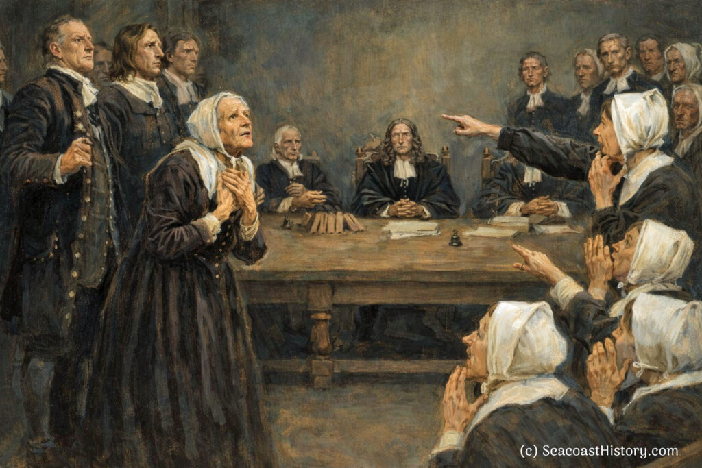 She was condemned by the ancestors of Seacoast families, some still living here – Marston and Phibrick, Moulton and Drake. Goody was prone, it appears, to curse out her neighbors. One threat, a neighbor testified in Norfolk Court, led to the death of two of his cattle. When she told another citizen that she wished his calves would eat poisonous grass and die, the calves were never seen again. Goody said she knew there was a witch in town, that she knew of a bewitched person who had turned a man into an ape, and the ape looked like the Marston’s child.