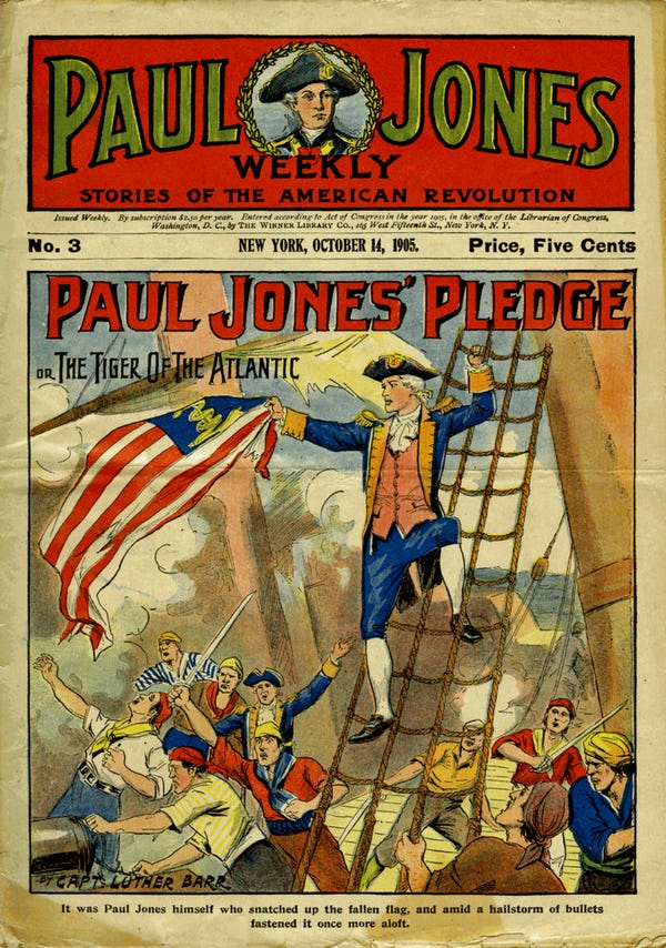 “The stories which will appear in the Paul Jones Weekly will be so fascinating and full of the spirit of patriotism that no real boy can resist the temptation to read them,” the publisher announced. But the “stirring sea tales” of “the gallant American hero” did not captivate its boy audience for long. Only 20 issues were produced and only 19 were published. Another Revolutionary War pulp franchise, “The Boys of 76,” continued through 600 issues.