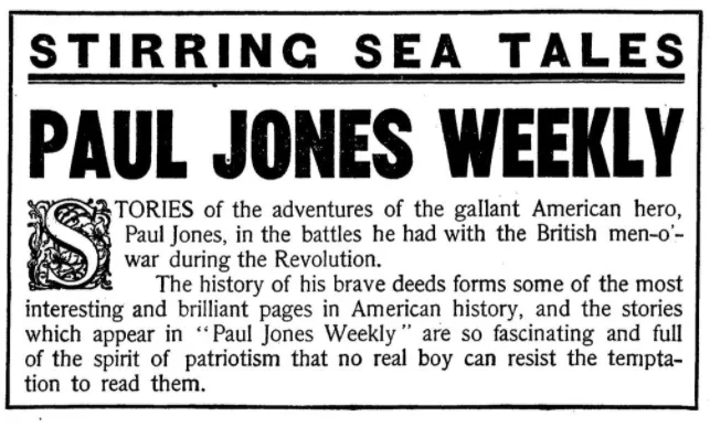 Two months after Jones’ mummified body arrived at Annapolis, Maryland, the first issue of Paul Jones Weekly hit the newsstands. There’s no question who snapped up copies of the 32-page magazine with its brightly colored cover. “Boys,” the editor announced in bold letters, “if you want a rattling good tale of stirring Revolutionary days, don’t pass the Paul Jones Weekly by.”