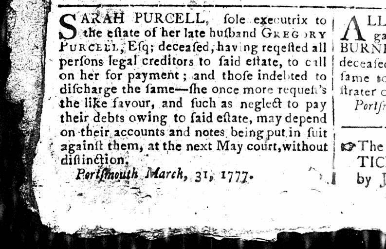 I practically fell off my chair when Sarah Purcell’s name appeared in a small advertisement in the Freeman’s Journal. She is the woman who, legend says, rented Jones a room in the yellow gambrel-roofed colonial that still sits on the corner of State and Middle streets. Mrs. Purcell, it read, regretted that she could not currently repay all the debts she owed since her husband’s untimely death just months before. But she would get the money, somehow she promised, and repay all. The theory, often told at the Paul Jones Museum across the street from Portsmouth Library, is that widow Purcell rented rooms to Jones and his steward in order to pay her debts and support her eight children. Was this what the notice implied?