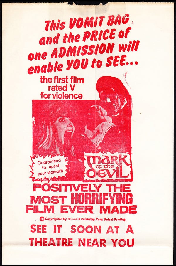 Desperate for audiences at any cost, the Civic bottomed out with “Mark of the Devil,” a German-made schlockfest billed as “Positively the most horrifying film ever made” and “rated V for Violence.” Set in Austria, the film depicts the torture of women accused of witchcraft–and most horribly, is based on historical facts. It was marketed in the USA by the distribution of vomit bags printed with the disclaimer that the film was “Guaranteed to upset your stomach.” Today, in a world highly desensitized to violence, that phrase might accompany the evening news.
