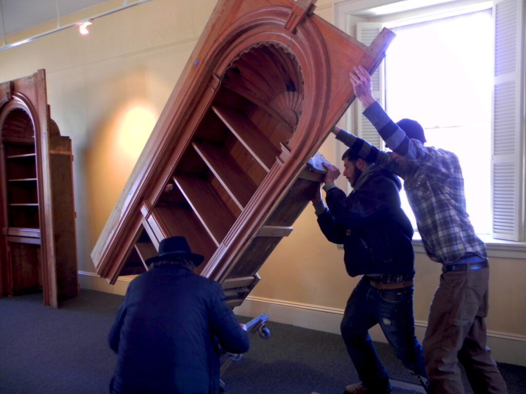 Much of the decorative woodwork inside the once-grand Sparhawk Hall was sold off piece by piece. Luckily the two surviving cupboards and the connecting panel were sold to the Woolworth family of Monmouth, Maine in 1953. Careful observation at this time proved that the two features were made by different craftsmen almost 150 years apart. The surviving cupboards and mantelpiece panels have since been moved and restored. Recently resold, they are on their way to a new location in Rhode Island, far from the Piscataqua Region.