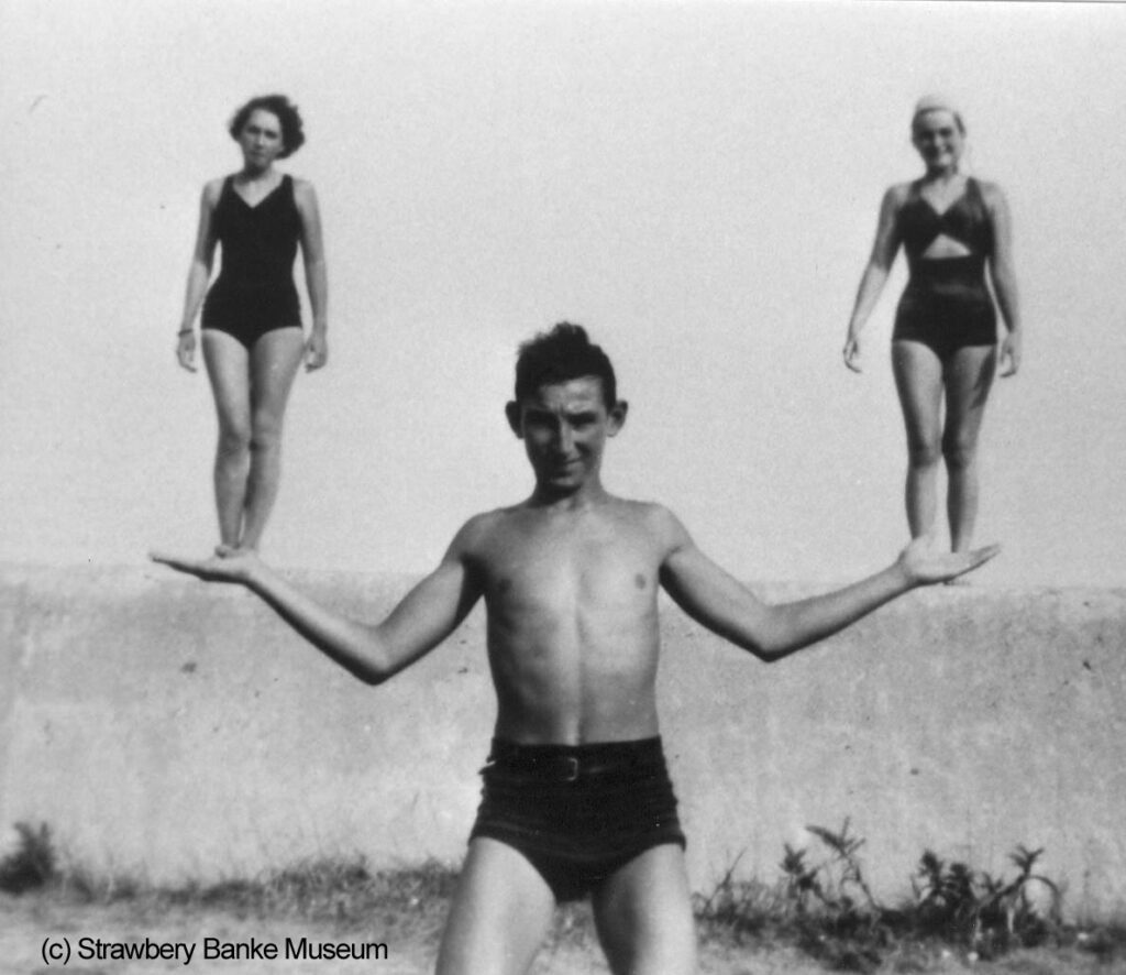 Today’s Kodak Moment represents the height of summer fun in the South End. Long before Photoshop, Puddle Dock residents Dickie Tibbetts and Joan and Doris Finnigan composed this clever special effects photo. A Xeroxed booklet featuring hundreds of gray-toned shots from the Puddle Dock reunion can occasionally be found among vintage books on eBay. It serves as a scrapbook of one more Portsmouth neighborhood, lost, but certainly not forgotten.