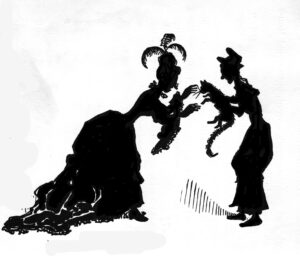 Aldirich referred to his translation as “so slight a performance” when compared to the “the ingenious and spirited series of silhouettes” by Hopkins. You can view a copy in the History Room of the Portsmouth Public Library or see a digital version online as part of Project Gutenberg. And while the cat appears to suffer tough times at the opening of the story, the feline protagonist, Monmouth, looks happy and well with his partner and six lively kittens in the final illustration.