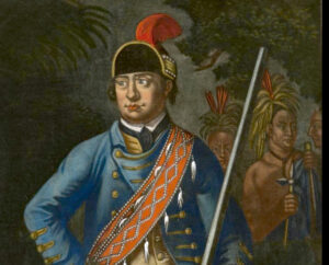 Rangers carried “a firelock, sixty rounds of powder and ball, and a hatchet” and stood to inspection daily. They practiced their marksmanship, which the British saw as a waste of ammunition. They were experts at capturing enemy scouts and extracting information by any means necessary. Rangers marched in single file to keep one shot from killing two men. They were advised not to fire in battle until the enemy was very close, and were invited to disperse and run away if the odds were against them. A set of 28 rules told rangers how to travel in marsh, woods and along rivers, how to scout, to eat, to camp and to attack. Rangers carried their own food separately and could travel by canoe, afoot, on snowshoes and even ice skates. British forces, bound by a wholly different European code of battle, considered the unconventional rangers primitive, but valuable against the elusive French and Indian forces. Rogers, who had a “magnetic personality”, was made a major and hired by the British to develop nine companies of men, used largely as scouts. A student of Indian warfare, he created one company made up entirely of Native Americans. His mission, ultimately, was to obliterate the Abenaki-speaking tribes that had killed hundreds of British pioneers. Today re-enactors from Michigan to Oregon to Kentucky and New York still dress in green garb and relive the ranger lifestyle.