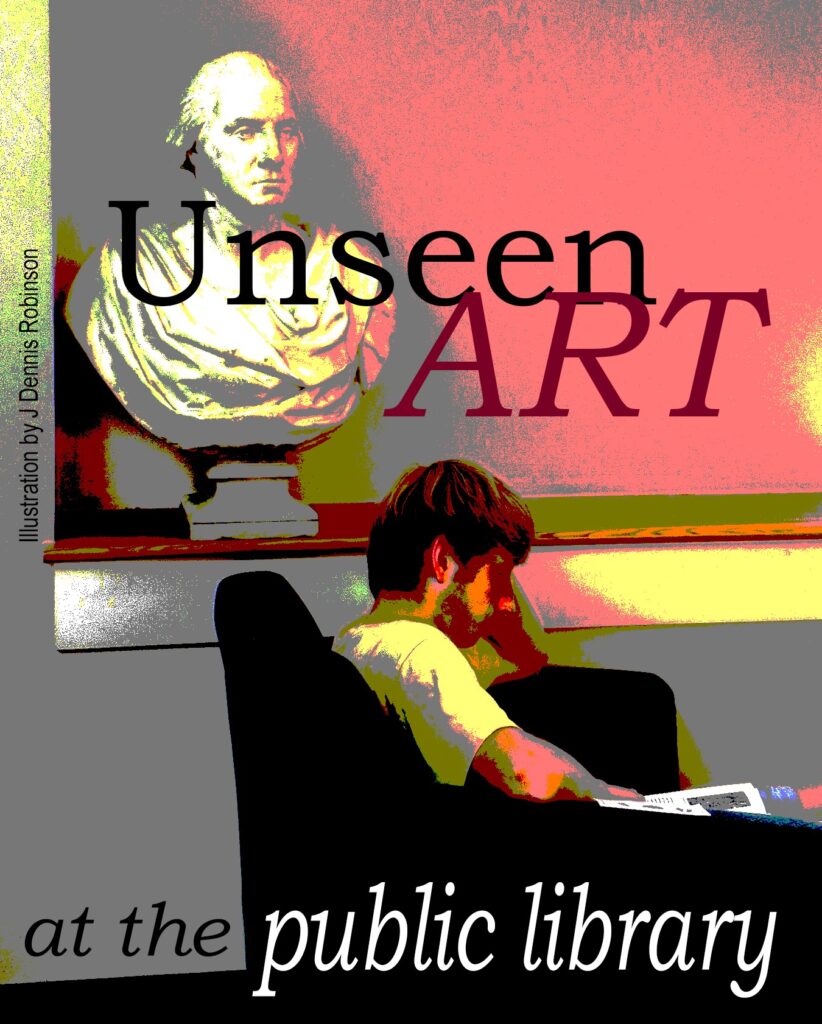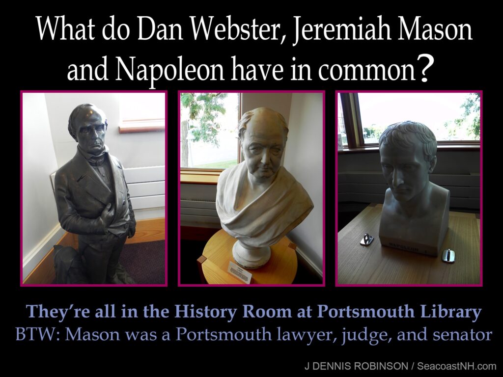 You will find most of your displayed items at the top of the circular stairway. Look for pallid white busts of George Washington and New Hampshire’s Civil War governor Ichabod Goodwin (whose house was moved from Islington Street to Strawbery Banke Museum). Inside the Special Collections Room are sculptures of Napoleon Bonaparte, Portsmouth lawyer and judge Jeremiah Mason, and Daniel Webster. A ferocious Chinese or Korean guardian lion, donor unknown, protects the desk of the reference librarian on duty. A photo of NH artist Lotti Jacobi hangs on the opposite wall.