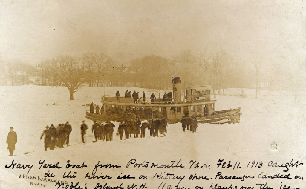 Passengers aboard the Navy Yard ferry #1048 from Portsmouth had to get out and walk back to shore in 1918. On February 11 the fast flowing Piscataqua River appeared to freeze solid. In fact, a mass of broken ice from Great Bay apparently caused a jam when the current reversed and the icebergs gathered together. Caught in the ice, the propeller failed on the Navy Yard ferry at 7am. The New Castle ferry was soon locked in too. When the tide shifted at 1 pm, the ice jam broke up and both boats were freed.