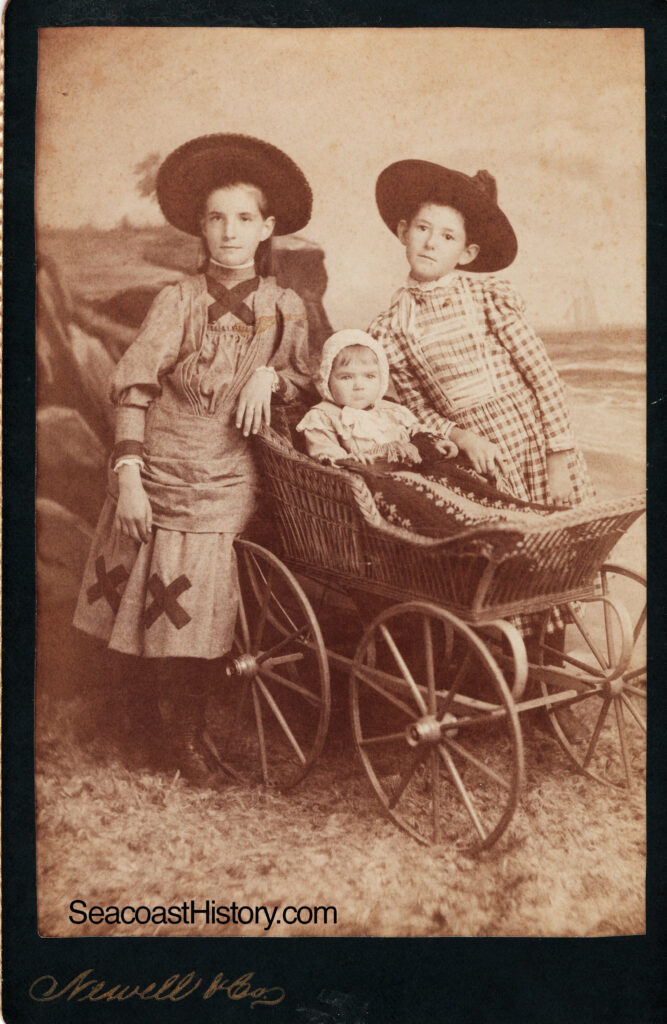 Newell is responsible for a great many of the key images we have of Portsmouth and its people. This shot, taken at his studio at 1 High St. in downtown Portsmouth, shows his level of skill. The two girls lean in toward the baby in the center. They appear almost comfortable, nearly casual. The fake painted rock ledge fades naturally into the background. The horizon is perfectly placed. The carpet of leaves and dirt appears natural, and while the wicker baby carriage in the center is huge, it is well placed at a diagonal and slightly cropped out of frame at the right. Like many of Newell’s cabinet card photos, this one is printed on super heavy stock with a scalloped edge tinged in gold.