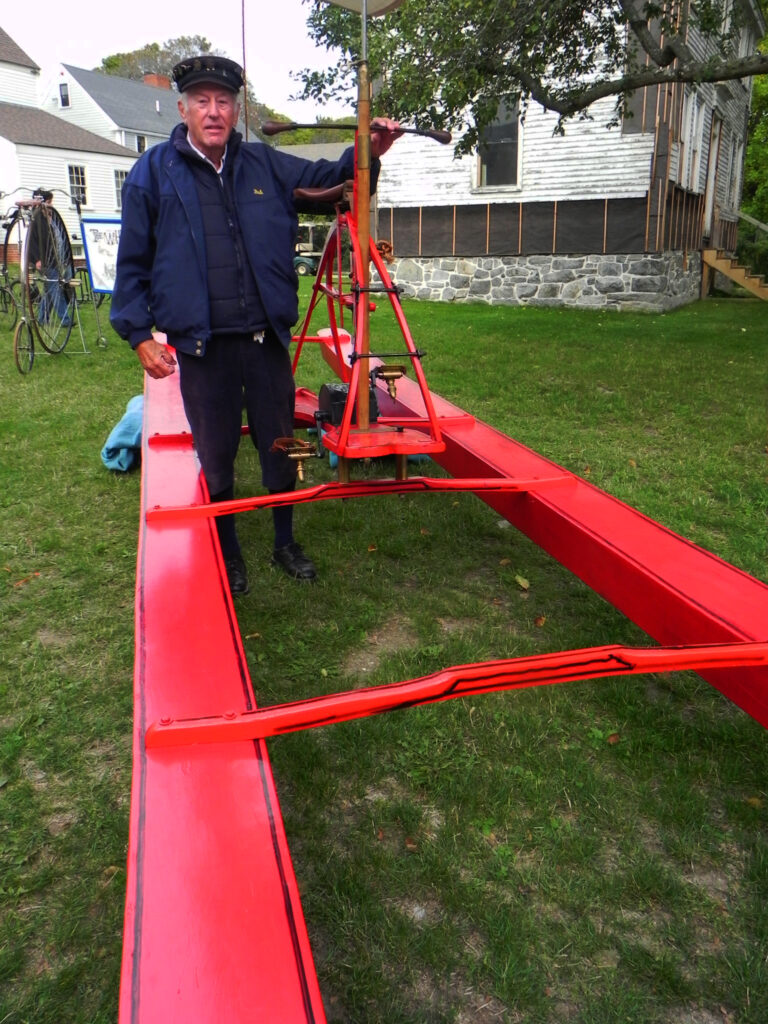 Stephen Hartson of Greenland, currently “captain” of the New Hampshire chapter of The Wheelman has been riding antique bikes since he was 10. His father Robert, still rides a high wheeler. The family tradition began in the 1960s when Hartson’s’ grandfather found a discarded “Penny Farthing” at the dump. That doesn’t happen anymore, he says, when a collectible bike can be worth over $10,000. The Wheelmen ride only vintage bikes dated from 1818 to 1917. A working original can be purchased these days for $1,500 to $2,000, Hartson says, and novice riders often start out on less costly reproduction cycles.