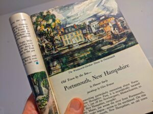 I’m a sucker for old musty magazine articles about Portsmouth, the mustier the better. This one has the distant scent of mildew and White Owl Panetelas. I paid too much for it since the story about Portsmouth runs only three pages out of 130 total. This 1955 issue of “New England Journeys,” however, has a lot to offer on the history of Portsmouth tourism, one of my favorite topics.