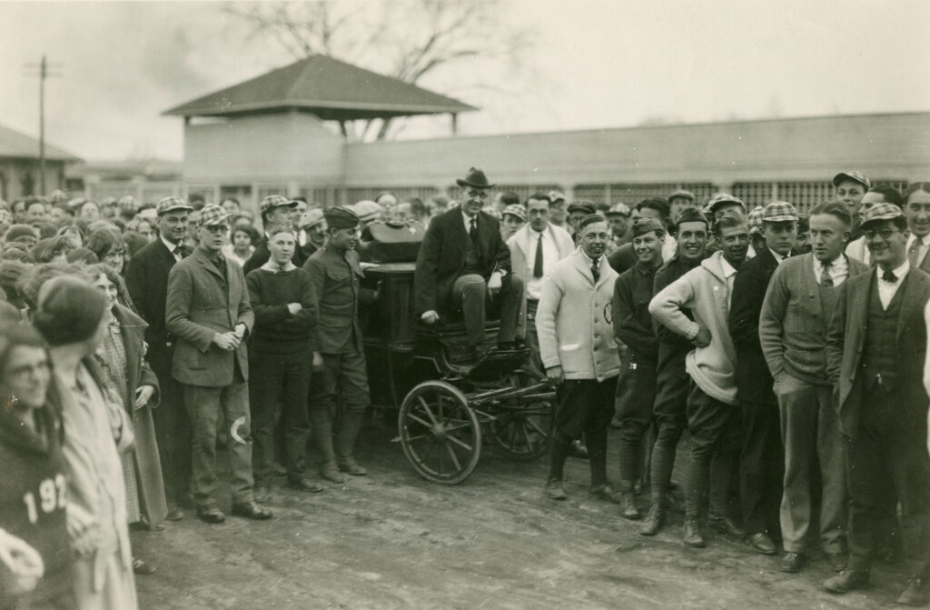 In the early 20th century, according to The Portsmouth Herald, an authentic Tom Thumb carriage was included in a number of seacoast parades. It was on loan from the University of New Hampshire. The carriage played a role in local history when, in 1923, school President Ralph Hetzel successfully convinced the New Hampshire state legislature to upgrade the Durham college to a state university. Arriving back in Durham from Concord, President Hetzel was met at the train station by a “wildly enthusiastic group of students.” According to UNH history, Hetzel was required to sit atop the Tom Thumb carriage that was then drawn through town by students “followed by a long line of undergraduates performing a snake dance.”