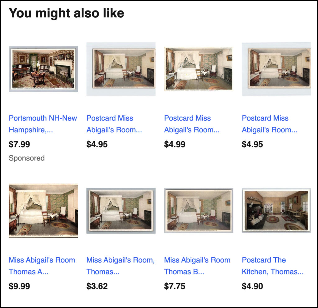 Today, for example, 36 new Portsmouth-related items are up for auction. Most of the offers are for postcards. The group pictured here all come from a pack of early 20th-century cards. They illustrate exhibition rooms from the opening of the city’s first history museum. The Thomas Bailey Aldrich Memorial on Court Street opened in 1908 to honor the then-famous poet and novelist who had lived there briefly as a boy with his grandparents. That was in the 1840s.
