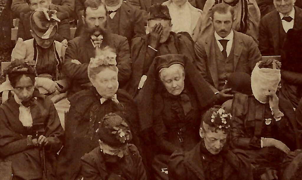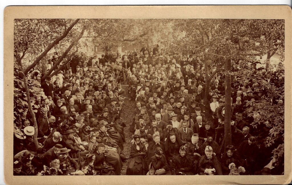 After weeks of cherished privacy in his New Hampshire hideaway, Whittier’s funeral was a highly public affair. At least 5,000 guests passed through the entrance of the poet’s home in Amesbury, now a museum. Stepping into a small central room, mourners turned sharply to the right where Whittier’s tall lanky body lay in state in the small parlor, stretched below portraits of his mother and sister Elizabth. A photograph taken from the second floor shows at least a thousand visitors crammed into the back yard during a funeral oration. Many mourners, including Celia Thaxter, can be seen wiping away tears.