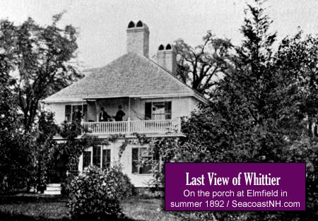 While at Elmfield, Whittier was happy to announce to other guests that he had managed to elude the pesky “pilgrims” for almost three weeks. He was unaware, when he suffered a stroke in early September, that a reporter from the Boston Globe was hiding in the bushes outside the Hampton Falls house. At the moment of the poet’s death, a nurse signaled the reporter by placing a lamp in the bedroom window.