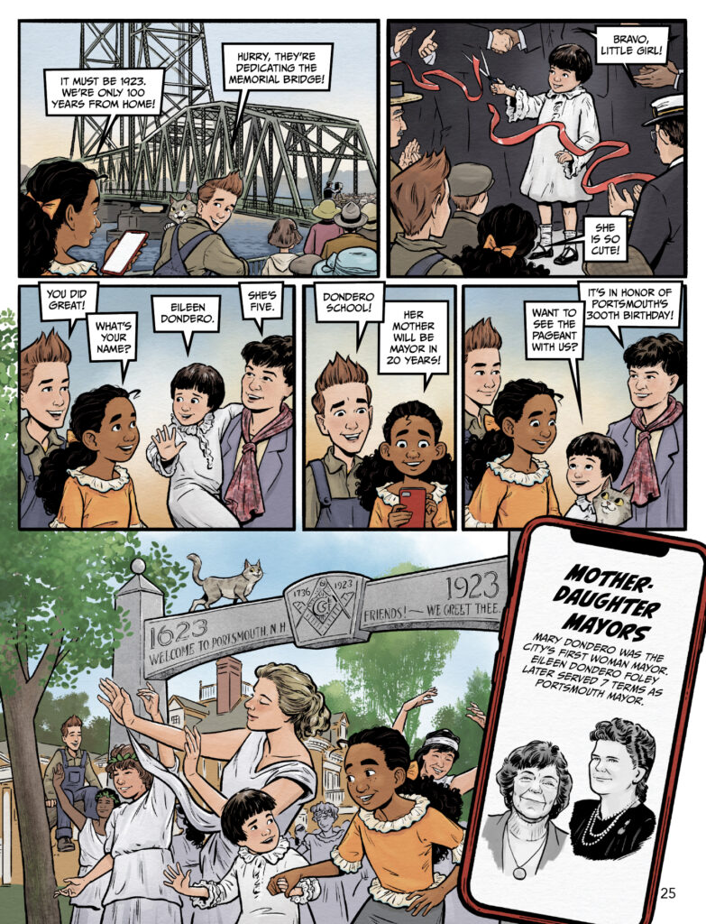 Ninety years later, after a record eight terms as mayor of Portsmouth, Eileen Foley was back in the exact spot. At age 95, sporting a cherry red Portsmouth Clippers jacket, she was on hand to re-dedicate a brand new $88 million Memorial Bridge. Accompanied this time by her granddaughter Ellie, the two made national news when they cut the ribbon on the bridge reconnecting New Hampshire and Maine.
