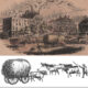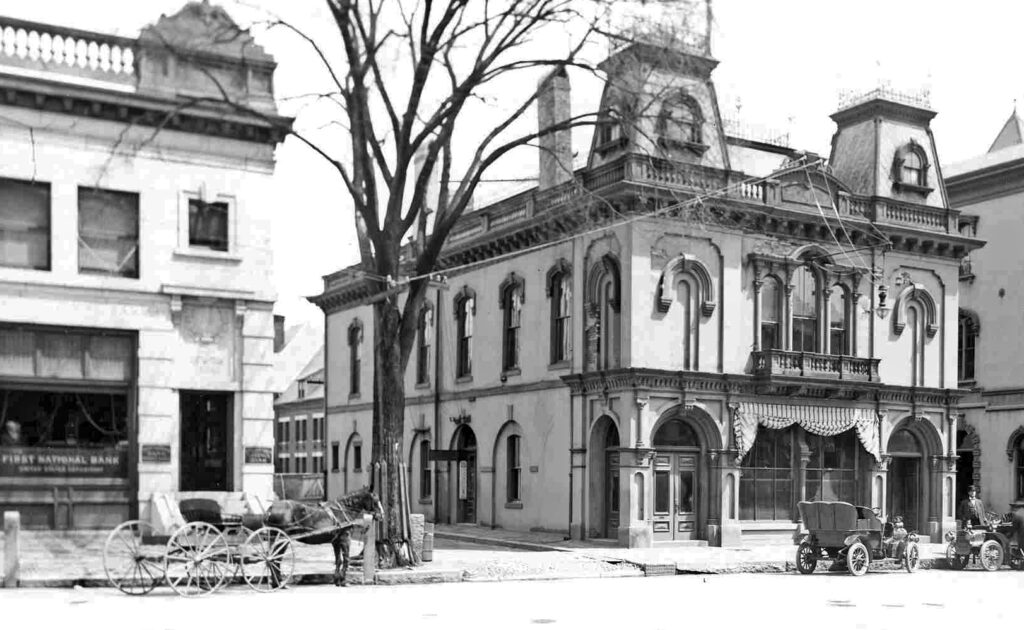 stalls on the first floor, was built in 1800. All but the outer walls burned in the great fire two years later and was rebuilt (center) in 1806. The upstairs meeting area, called Jefferson Hall, was adapted to use as a city hall soon after the Civil War. It was replaced by a modern bank building early in the 20th century. The market is gone, but the name remains.