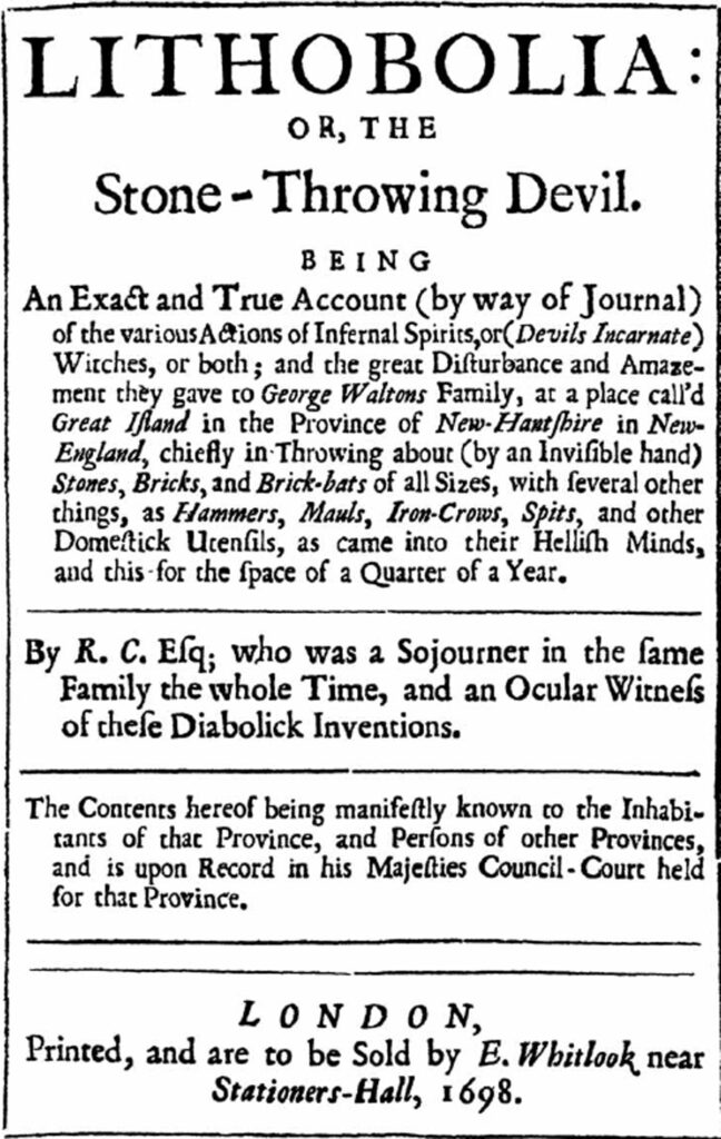 ” Sometime also being in America, (in His then Majesty’s service,) I was lodged in the said George Walton’s house, a Planter there, and on a Sunday night, about ten o’clock, many stones were heard by myself and the rest of the family, to be thrown and (with noise) hit against the top and all sides of the house, after he said Walton had been at his fence-gate, which was between him and his neighbor one John Amazeen an Italian, to view it; for it was again (as formerly) wrung off the hinges, and cast upon the ground; and in his being there, and return home with several persons of (and frequenting) his family and house, about a slight shot distance from the gate, they were all assaulted with a peal of stones, (taken we conceive, from the rocks hard by the House,) and this by unseen hands or agents. For by this time I was come down to them, having risen out of my bed at this strange alarm of all that were in the house, and do know that they all looked out as narrowly as I did, or any person could, (it being a bright moon-lightnight) but could make no discovery. There upon, and because there came many stones, and those pretty great ones, some as big as my fist, into the entry or porch of the House, we withdrew into the next room to the Porch, no person having received any hurt, (Praised be Almighty Providence, for certainly the infernal agent, constant enemy to mankind, had he not been over-ruled, intended no less than death or maim) save only that two youths were hit, one on the leg the other on the thigh, notwithstanding the stones ‘came so thick and so forcibly against the sides of so narrow a room. Whilst we stood amazed at this accident, one of the maidens imagined she saw them come from the Hall next to that we were in, where searching, (and in the cellar down out of the Hall, and finding nobody, another and myself observed two little stones in a short space successively to fall on the floor, coming as from the Ceiling close by us, and we concluded it must necessarily be done by means extraordinary and preternatural. Coming again into the room where we first were, (next the Porch) we had many of these lapidary salutations! but unfriendly ones; for shutting the door, it was no small surprise to me to have a good big stone come with force and noise (just by my head against the door on the inside; and then shutting the other door, next the Hall, to have the like accident; so going out again, to have another very near my body clattering against the board wall of the House; but it was a much greater, to be so near the danger of having my head broke with a mall, or great hammer brushing along the top of roof of the room from the other end, as I was walking in it, and lighting down by me; but it fell so, that my landlord had the greatest damage, his windows (especially those of the first mentioned room) being with many stones miserably and strangely battered, most of the stones giving the blow on the inside, and forcing the bars, lead and hasps of the casements outward, and yet falling back (sometimes a yard or two into the room; only one little stone we took out of the glass of the window, there it lodged itself in the breaking it, in a hole exactly fit for the stone, The pewter and brass were frequently pelted, and sometimes thrown down upon the ground: for the evil spirit seemed then to effect variety of mischief, and diverted himself at this end after he had done so much execution at the other. So were two candlesticks, after many hittings, at last struck off the table where they stood, and likewise a large pewter pot, with the force of these stones. Some of them were taken up hot, (and it seems) coming out of the fire; and some (which is not unremarkable) having been laid by me upon the table along by couples, and numbered, were found missing; that is, two of them, and we returned immediately to the table, having turned our backs only to visit and view some new stone-charge or window breach, and this experiment was four or five times repeated, and I still found one or two missing of the number, which we all marked, when I did but’ just remove the light from off the table, and step to the door and back again.